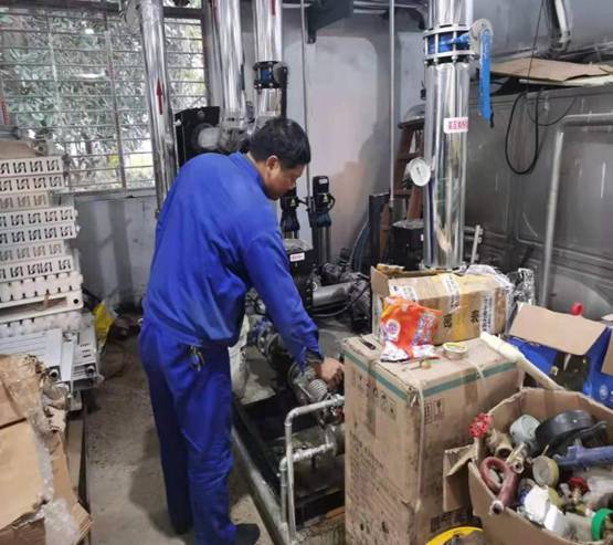 (圖為維修人員在特飛所小區(qū)熱交換站檢查供熱設(shè)備)